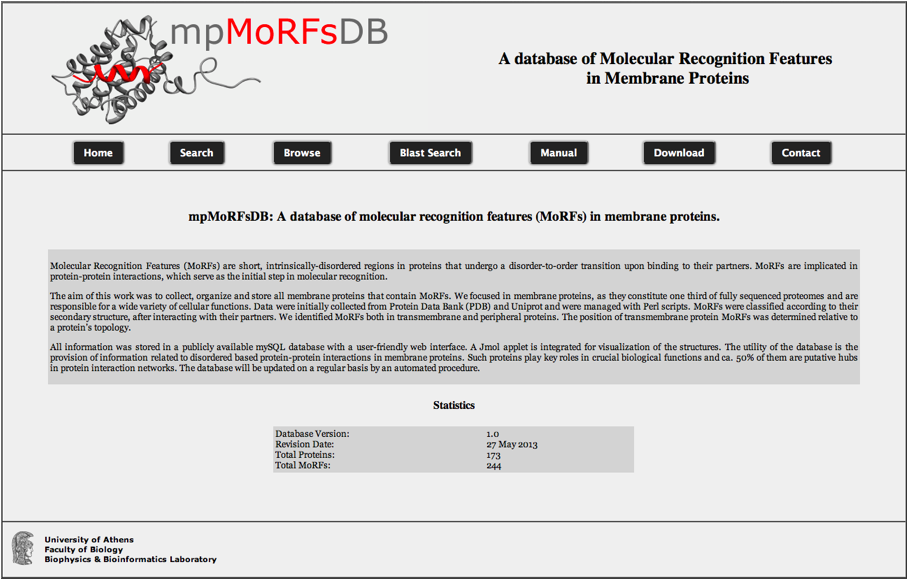 addresses: http://bioinformatics.biol.uoa.gr/mpMoRFsDB/ or http://bioinformatics.biol.uoa.gr/mpMoRFsDB/index.php. The page loaded (see below) contains general information about the